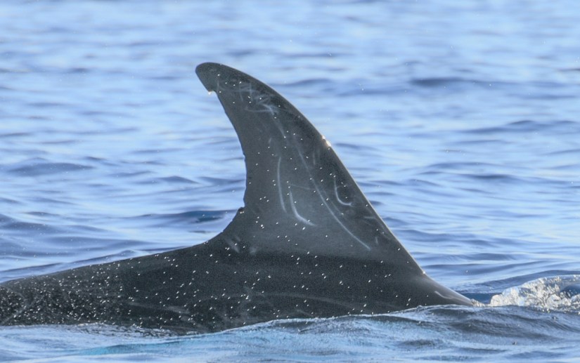 Il tema di ricerca principale cui ci dedichiamo è l’eco-etologia delle specie di cetacei (delfini e balene) presenti nell’Arcipelago delle Pelagie (Lampedusa, Linosa e Lampione). Le isole Pelagie sono considerate un “hotspot di biodiversità” per queste specie. Pensate che l’area consente di studiare almeno 5 delle 8 specie regolarmente osservabili in Mediterraneo quali: la balenottera comune (Balaenoptera physalus), il delfino comune (Delphinus delphis), la stenella striata (Stenella coeruloealba), il grampo (Grampus griseus) – foto sotto – e il tursiope (Tursiops truncatus).